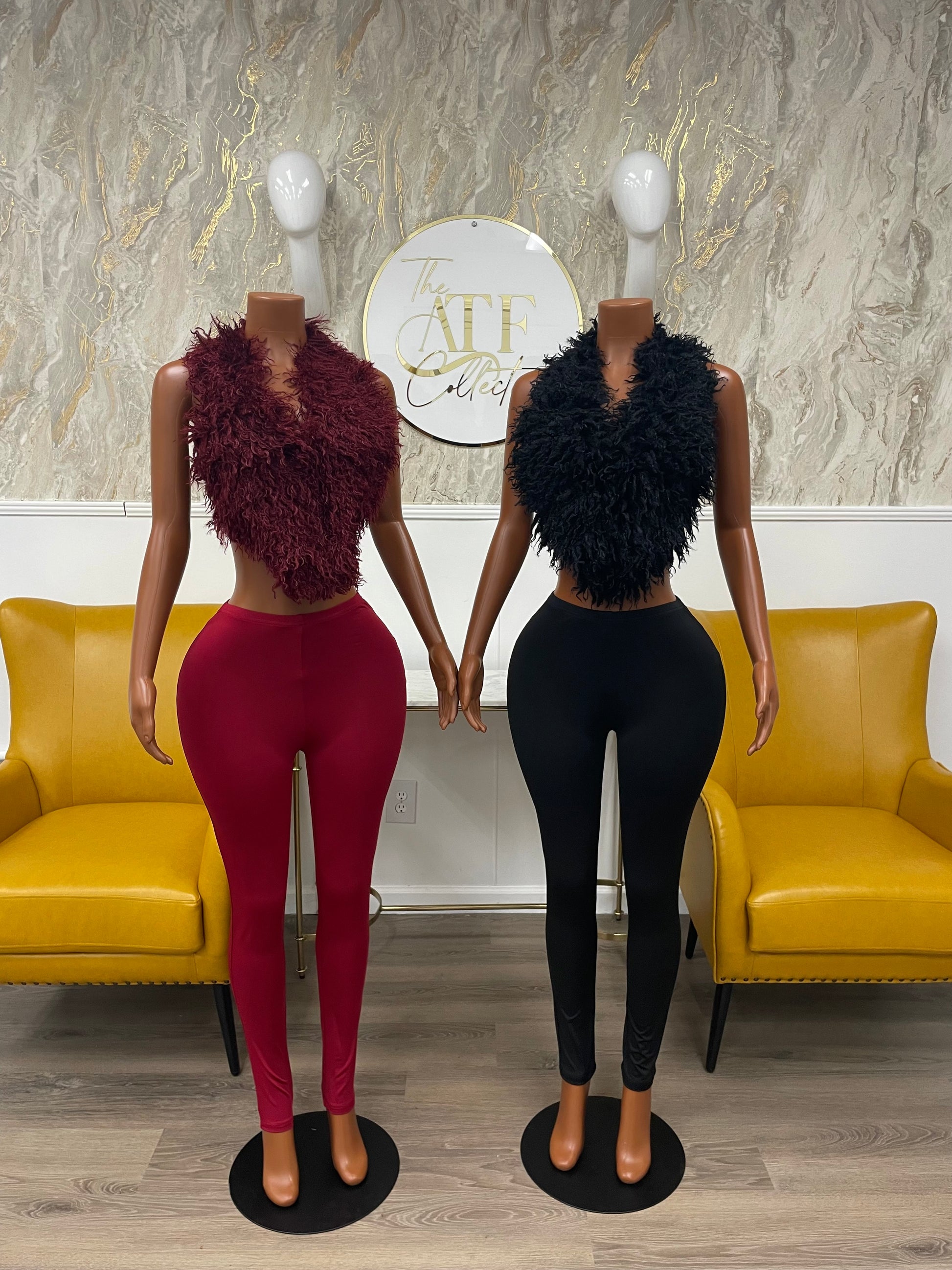 Feathered top that ties in the back and nylon leggings